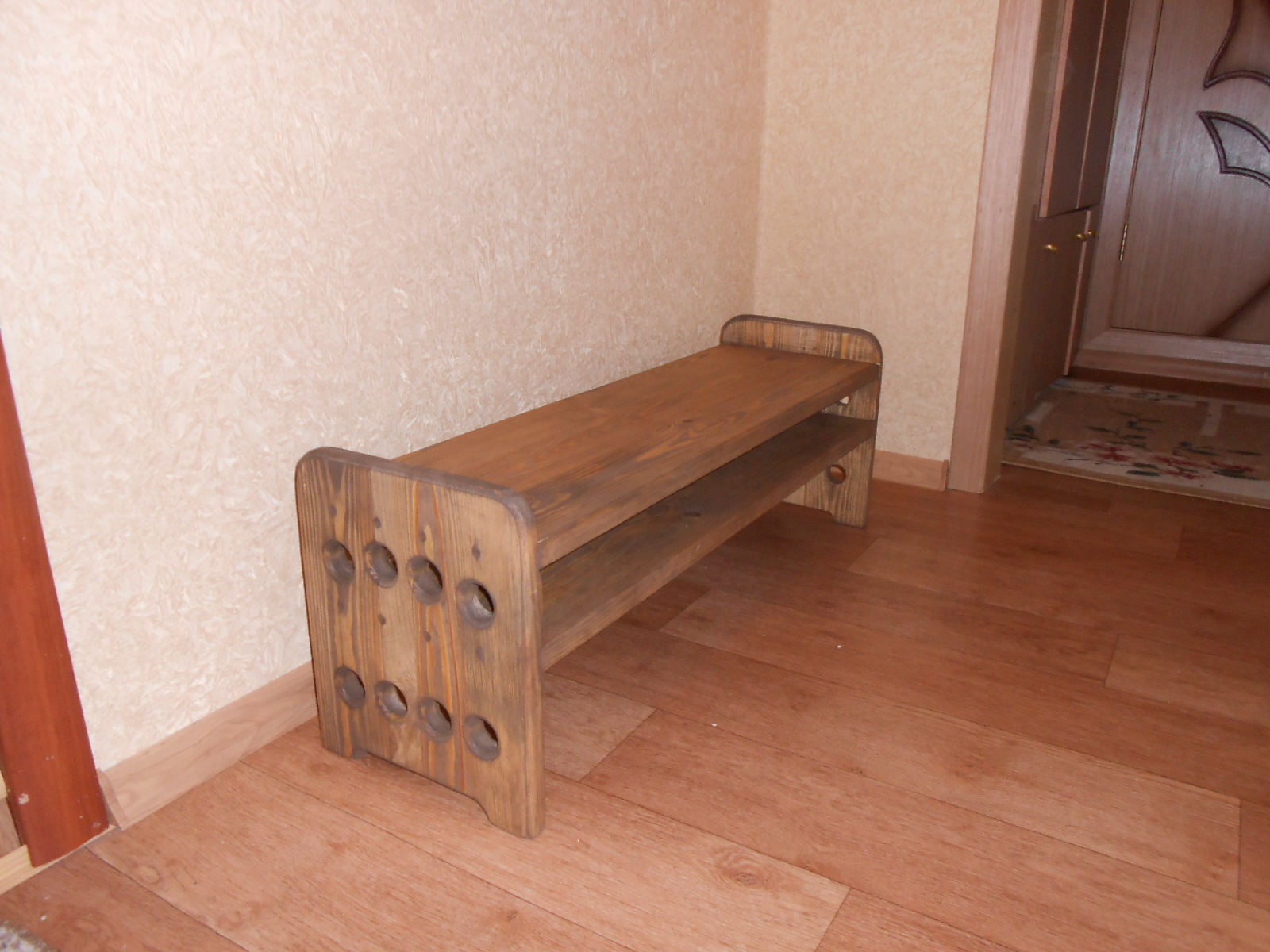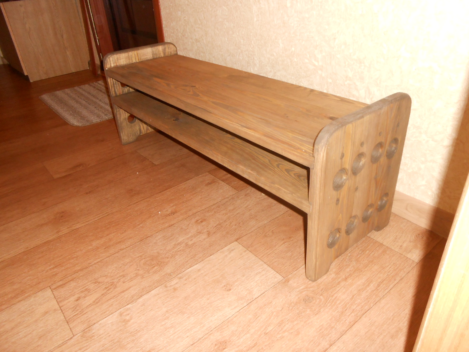 Полка для обуви ,материал ,массив сосны, покрытие биотекс, лак матовый, цвет палисандр.